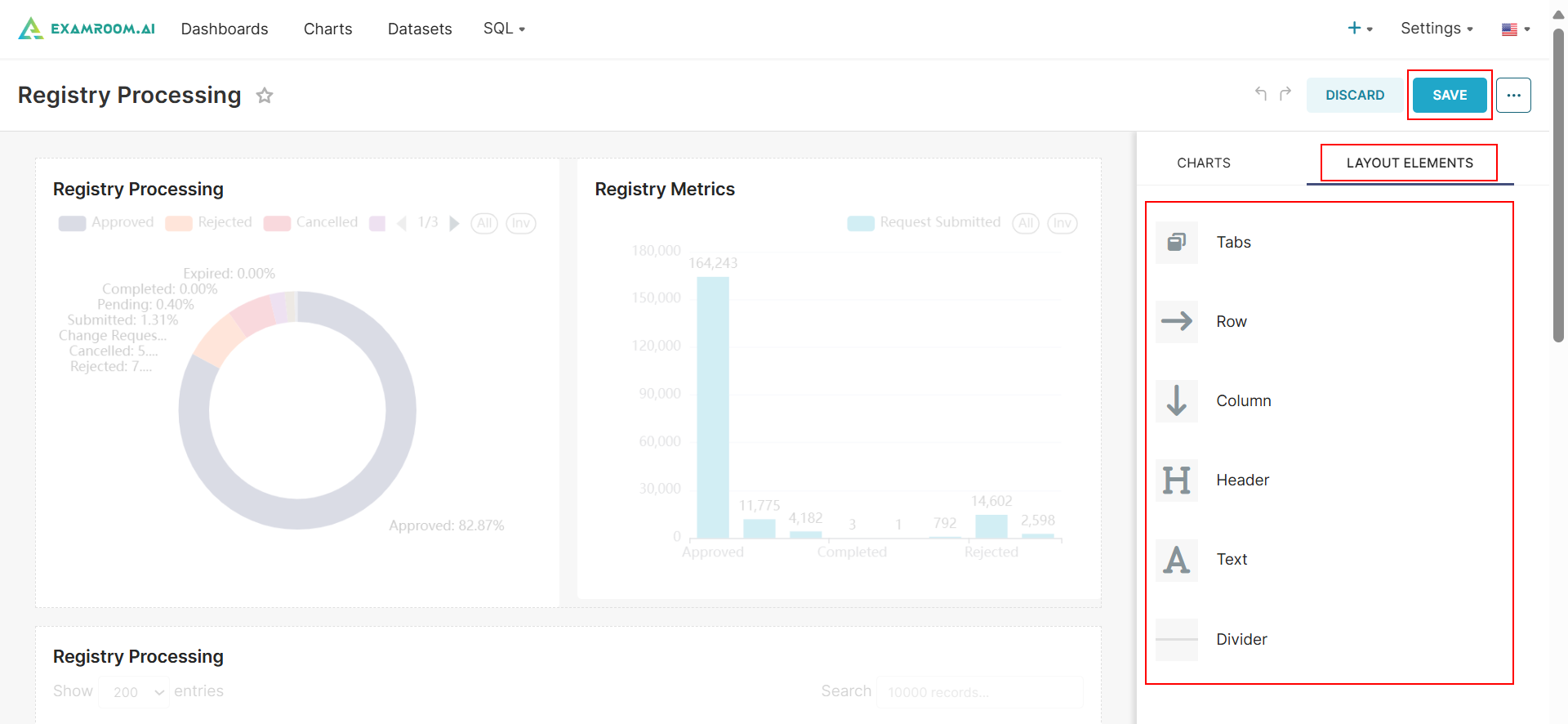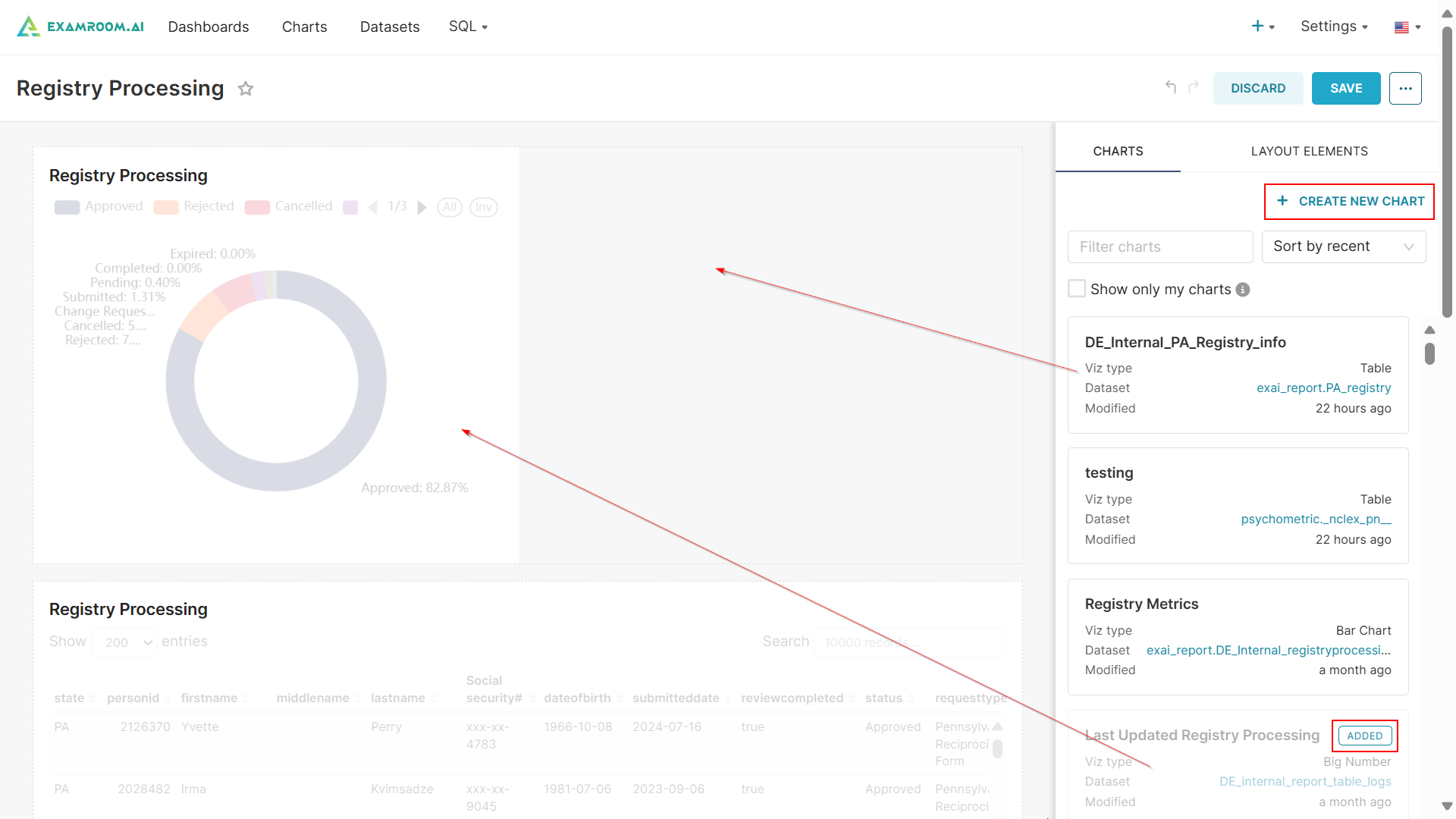 Note: A chart must be created and saved to a dashboard in order for it to appear in the chart list and be available for addition to the dashboard. - Drag and drop details from the charts onto the dashboard.