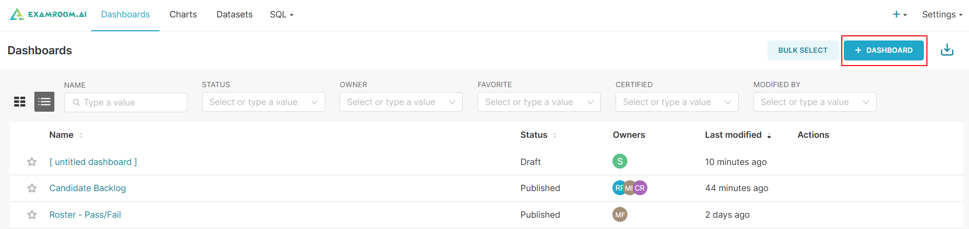 - Click Dashboards from the toolbar and click the +Dashboard to create a new dashboard.