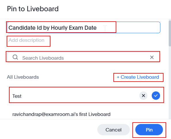 - In the Pin to Liveboard popup window, edit the title of the report, if required.