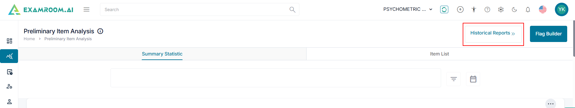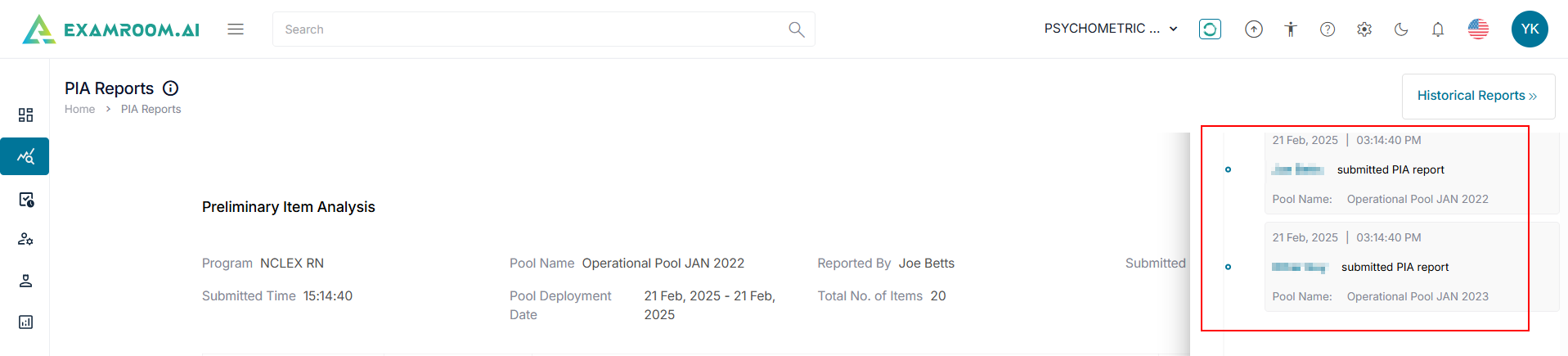 - The Preliminary Item Analysis section displays the item reports including Program, Pool Name, Reported By, Submitted Date, Submitted Time, Pool Deployment Date, and Total No. of Items.