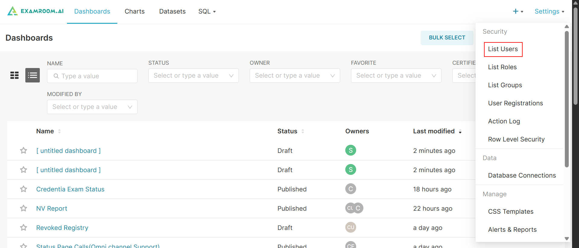 - In the ExamIQ, click Settings at top right corner of the screen and click List Users to navigate to the list user section.