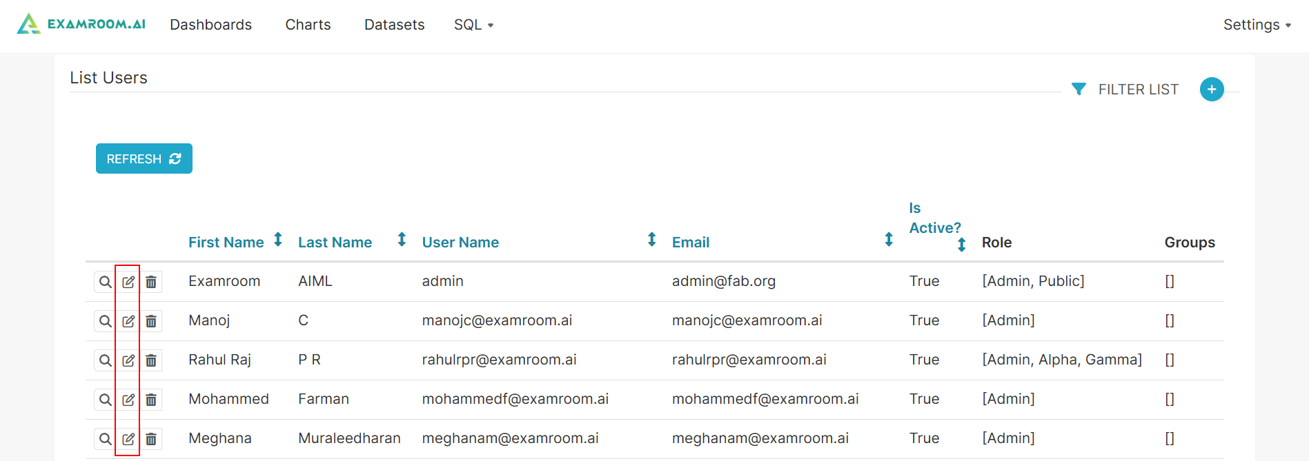 - In the List Users section, you can view all the existing users in the ExamIQ with their details including Name, Username, Email, Active Status, and Assigned Role.