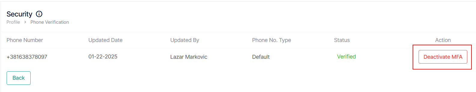 - To deactivate phone number verification, click Deactivate MFA under the Action column.