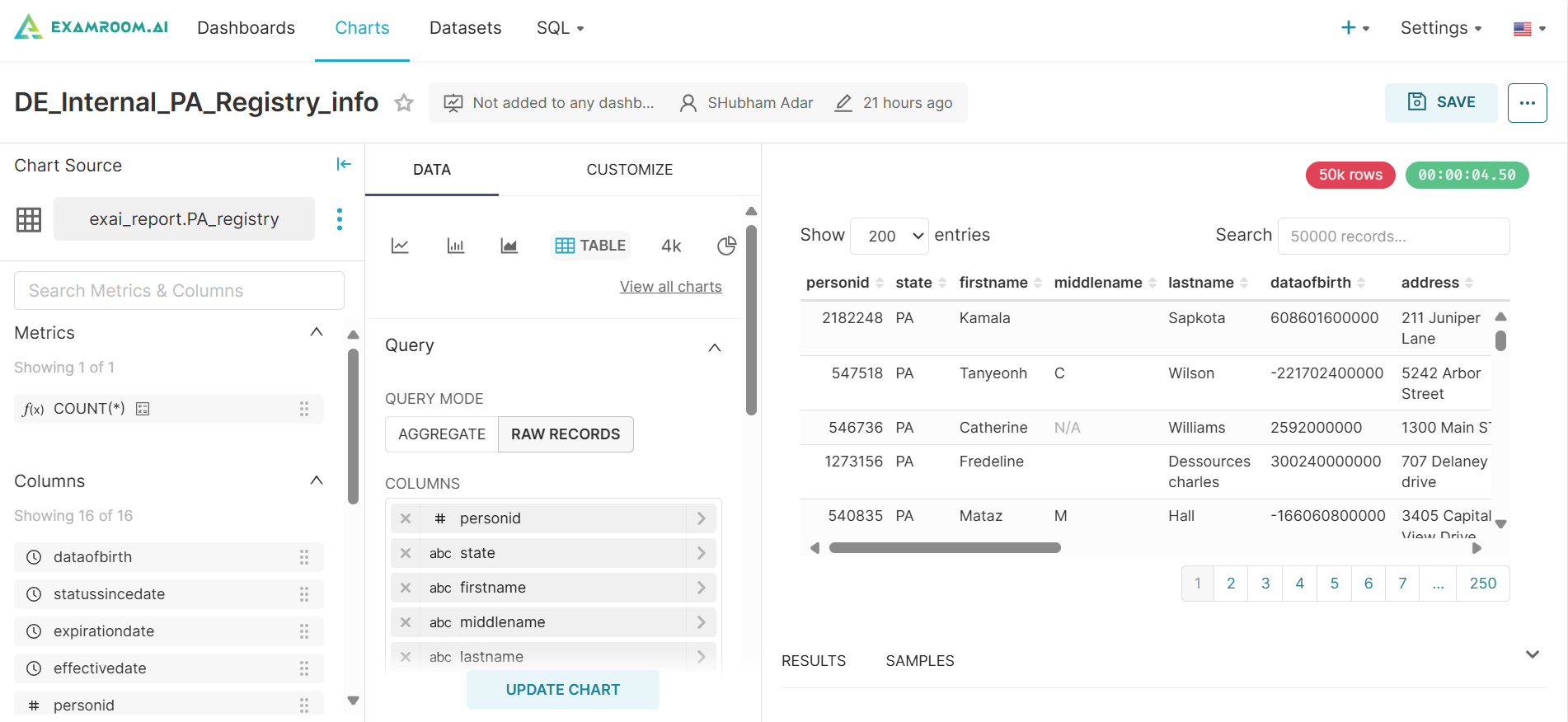 - Click the exam hyperlink in the Name column to view the Chart section.