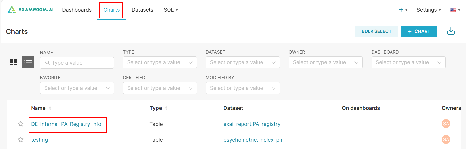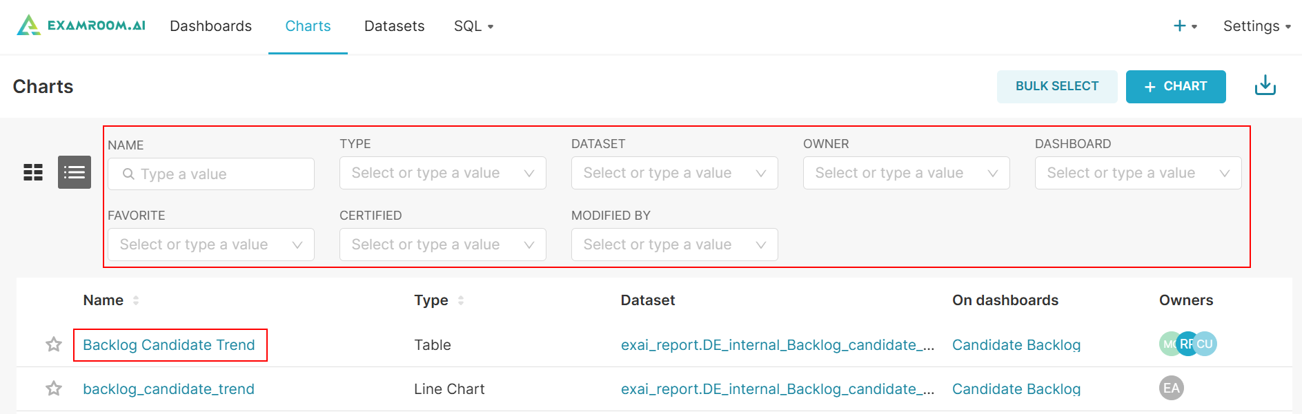 - Search or filter the list by entering the Name, or by selecting the Type, Dataset, Owner, Dashboard, Favorite, Certified, or Modified By.