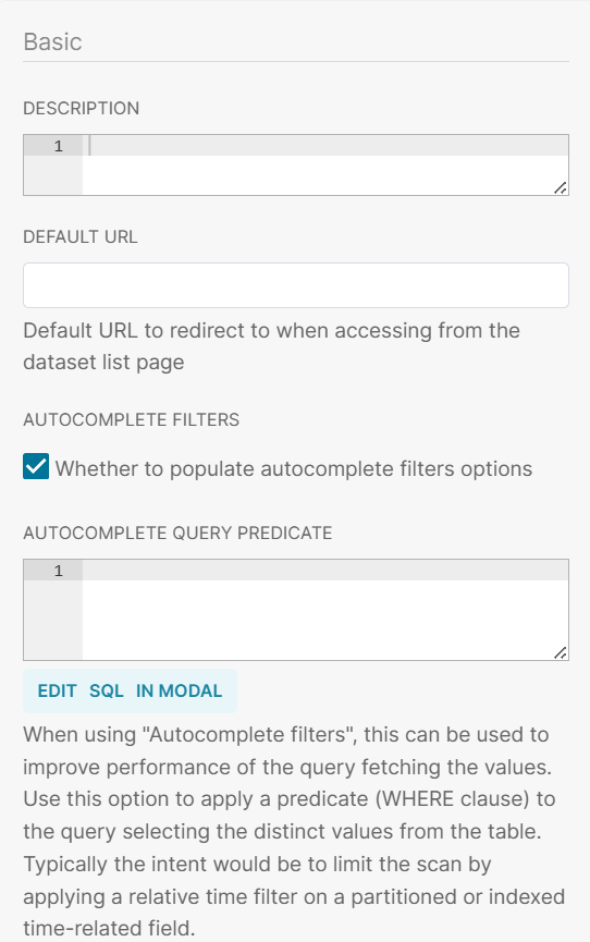 Note: When using "Autocomplete filters", this can be used to improve performance of the query fetching the values. Use this option to apply a predicate (WHERE clause) to the query selecting the distinct values from the table. Typically, the intent would be to limit the scan by applying a relative time filter on a partitioned or indexed time-related field.