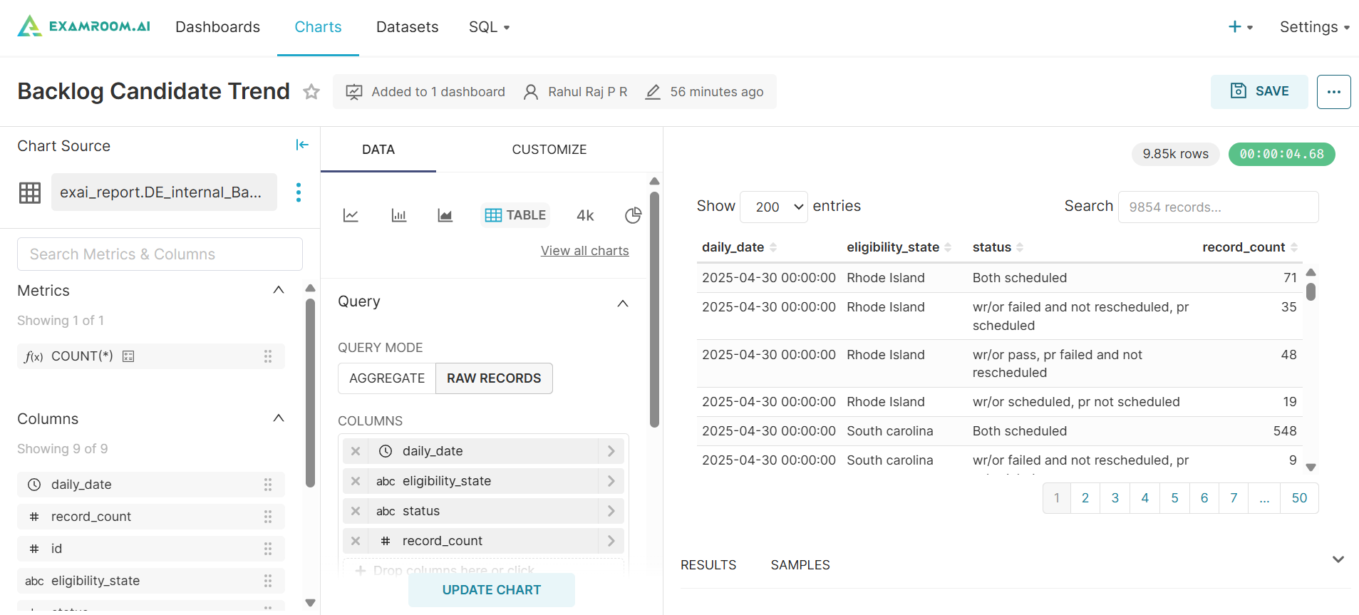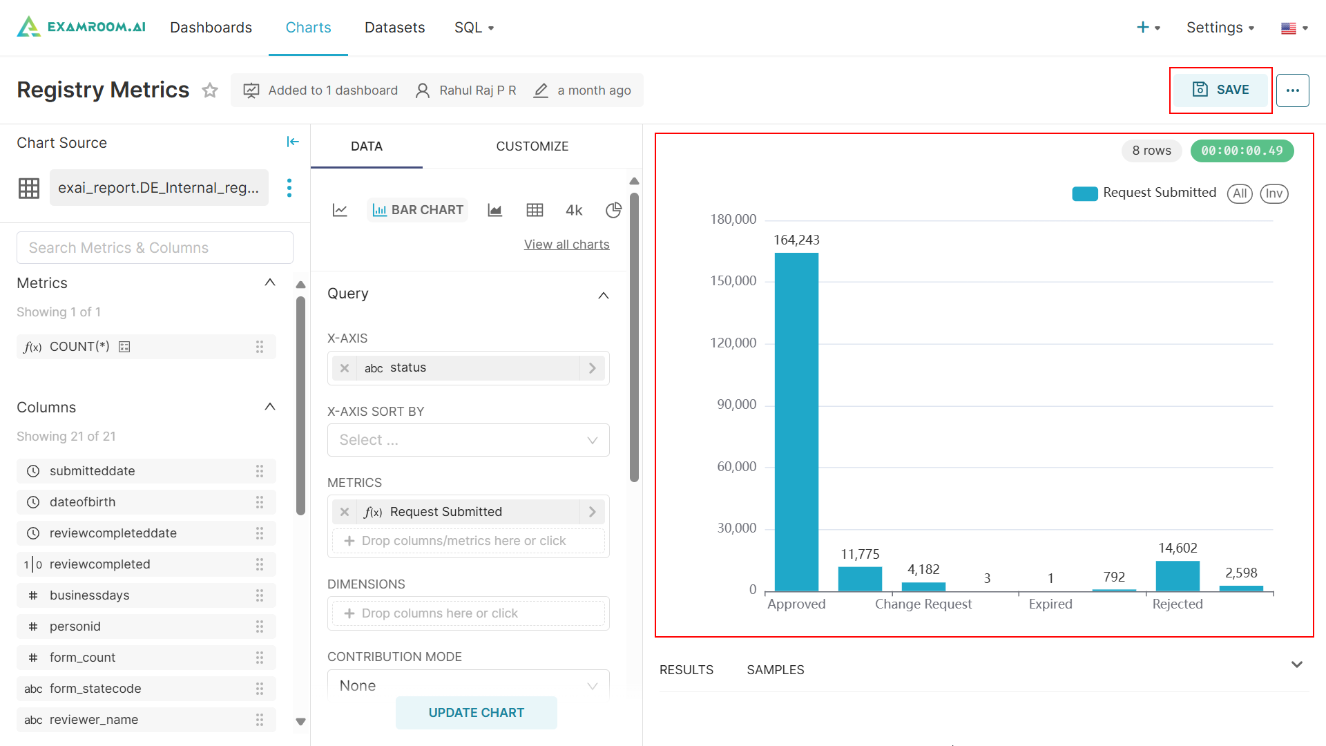 - Click SAVE to save the chart to the provided dashboard.