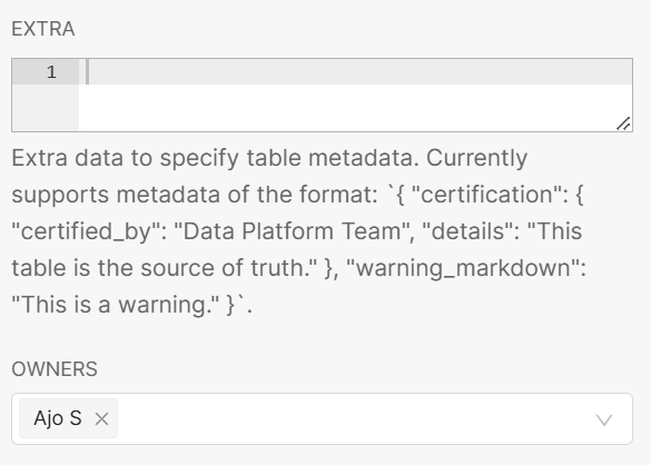- Enter Extra data to specify table metadata. Supported metadata format: `{“certification": { "certified by": "Data Platform Team", "details": "This table is the source of truth." }, "warning markdown": "This is a warning." }`.