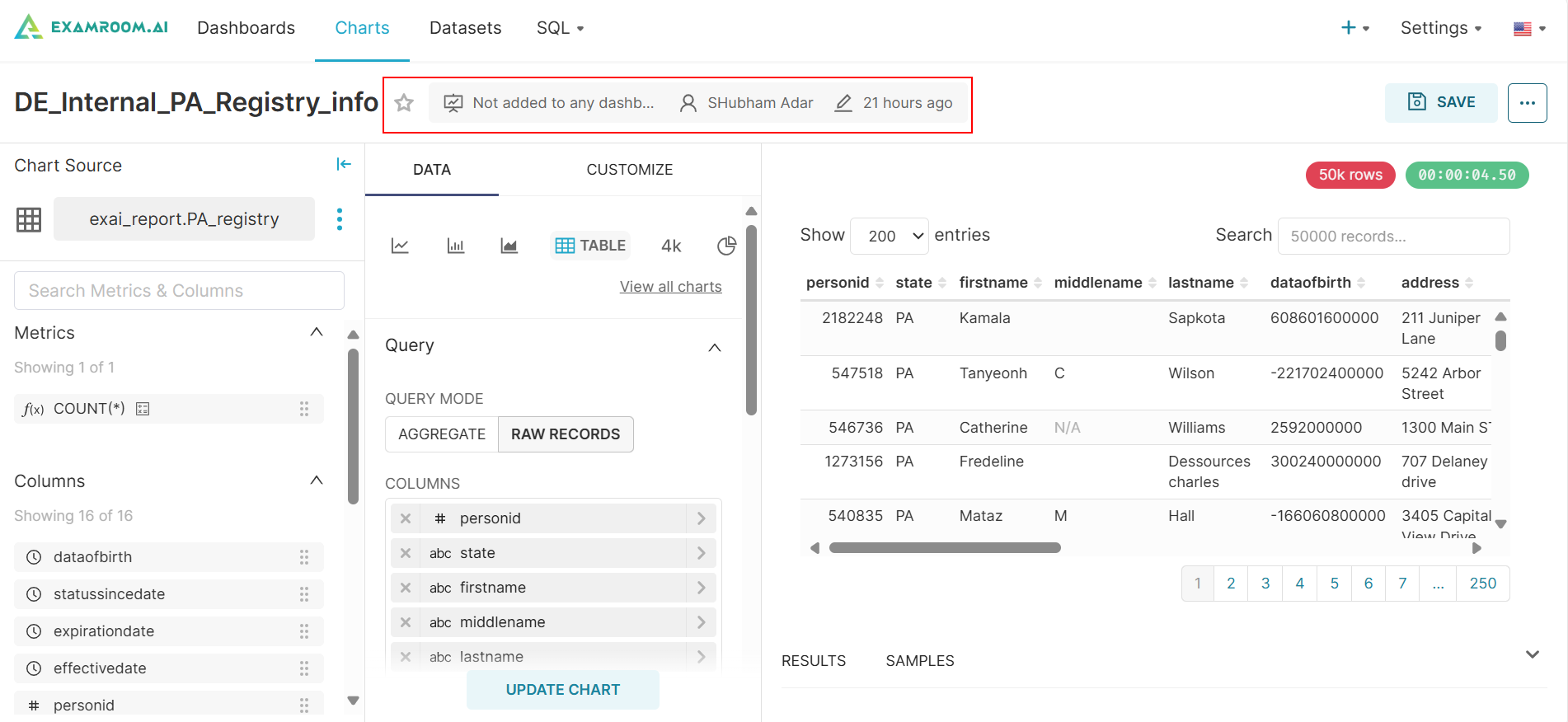 - Owners: Lists of the users who have ownership of the chart.
