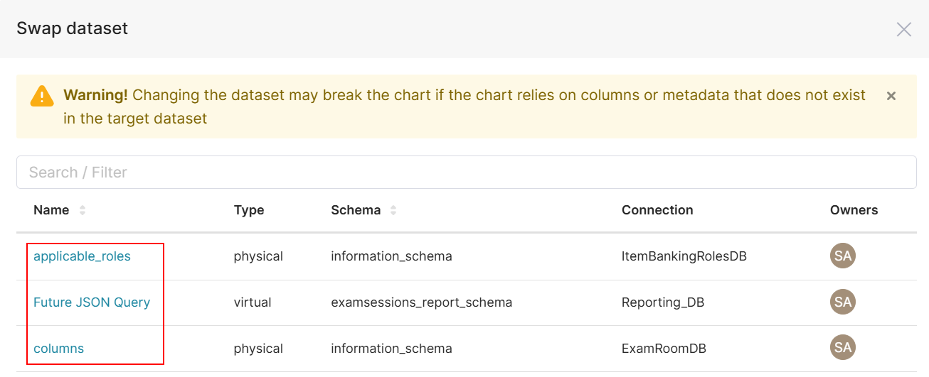 - Under the Name column, click the hyperlink to swap the dataset.