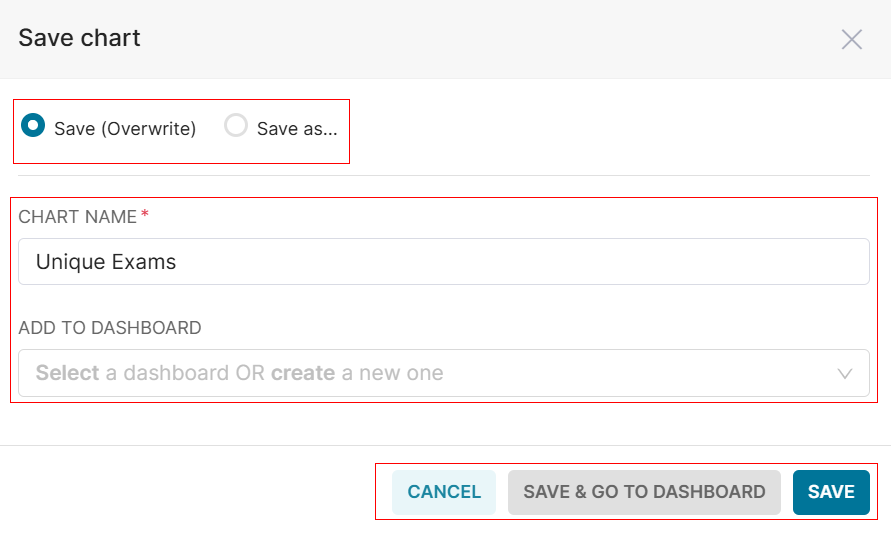 Note: If Save (Overwrite) is selected, the existing chart will be replaced. If Save as is selected, a new chart will be created. - Enter the Chart Name and select the Dashboard from the list.