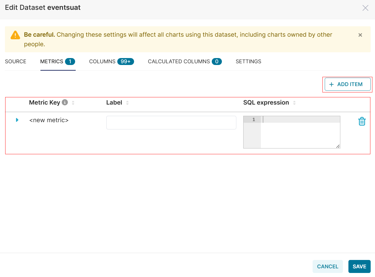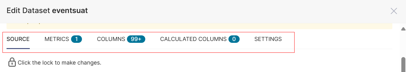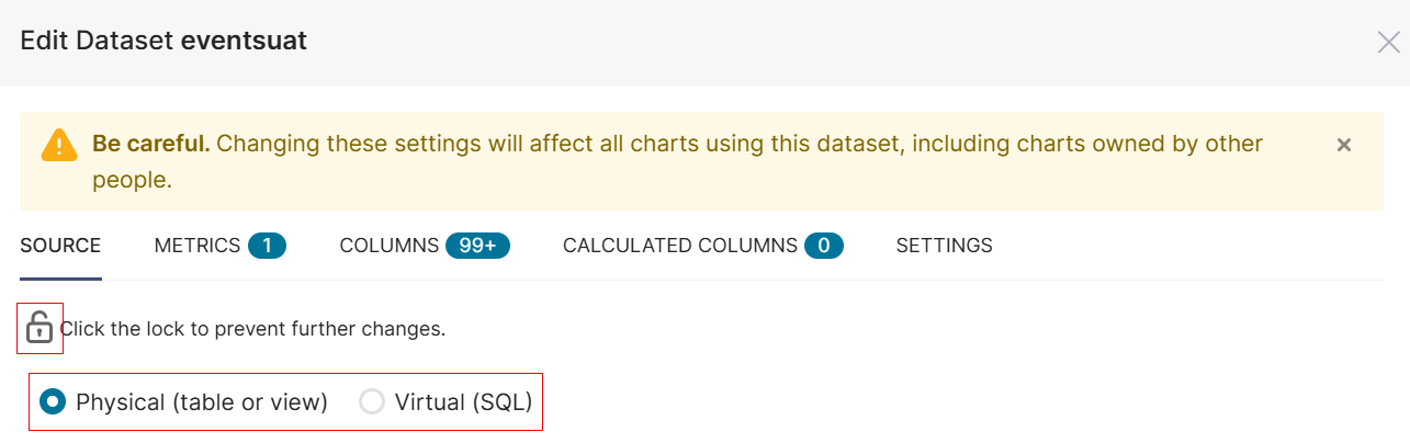 - Click Edit dataset from the Chart Source page to edit the Source, Metrics, Columns, Calculated Columns, and Settings.