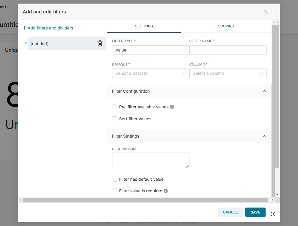 - Select the Filter Type from the dropdown list, enter a Filter Name, and choose the appropriate Dataset and Column from the respective dropdowns.