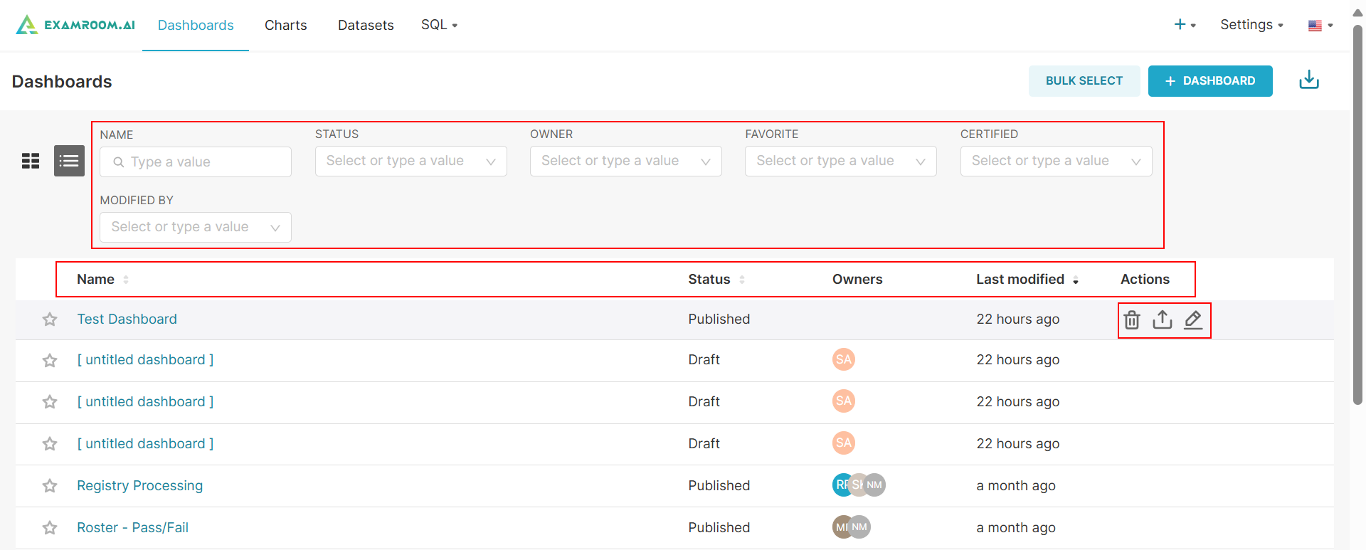 - On the ExamIQ dashboard, all the created dashboards and workspaces are displayed in a tabular format that includes the following details: