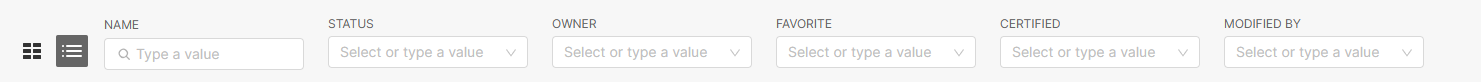 - Apply Filters: Search by criteria such as Name, Status, Owner, Favorite, Certified, and Last Modified By.