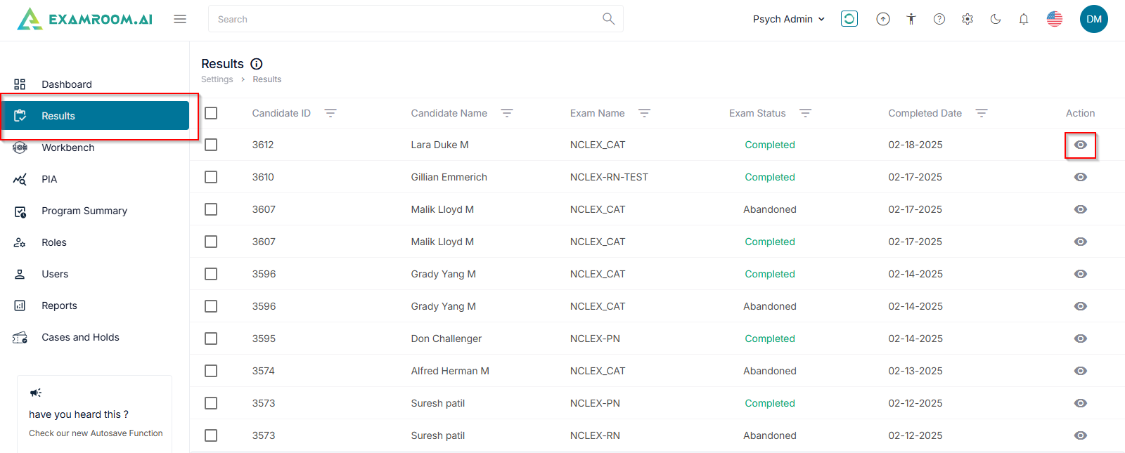 - Click the View icon under the action column to view the results details.