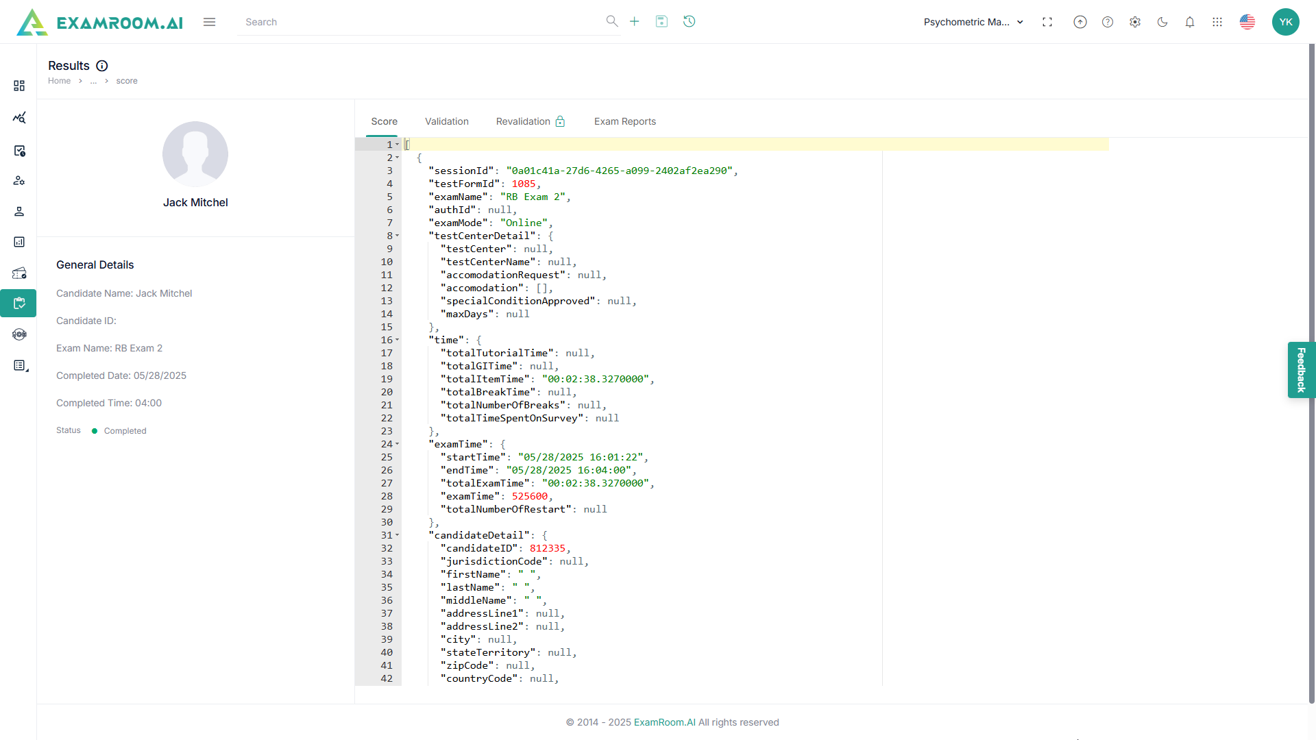 To view score, validate, revalidate and exam reports of a candidate in JSON format, follow the steps below:
