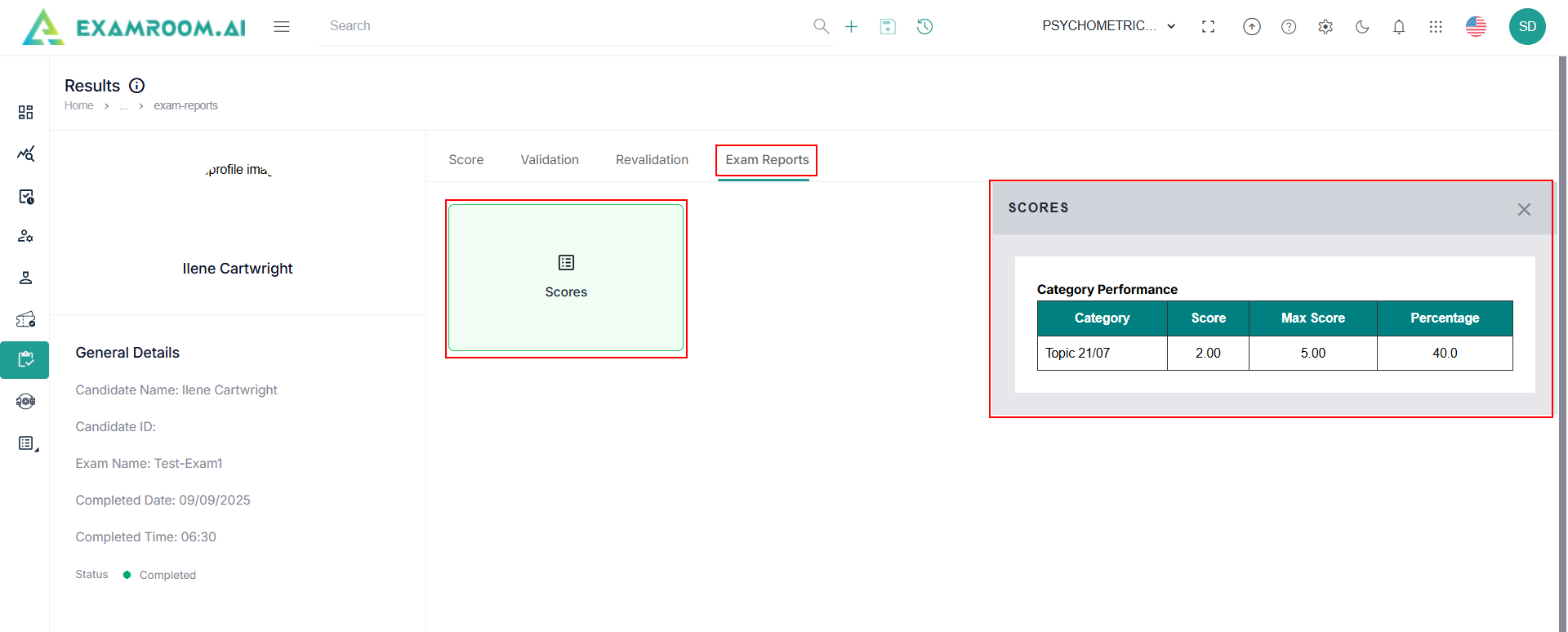 - Click Exam Reports tab and click Score to view the exam score category performance.